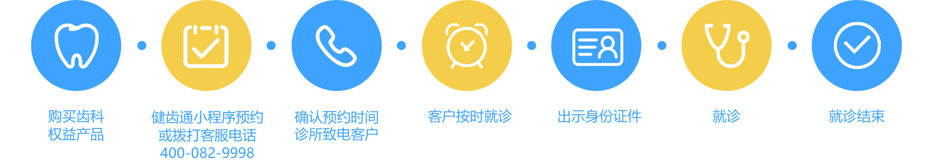 3. 预约方式 : 拨打全齿健客服电话400-082-9998, 进行预约信息并确认, 在预约成功后24小时内, 预约的诊所会对您进行电话回复,确认最终预约时间, 请保持手机畅通。